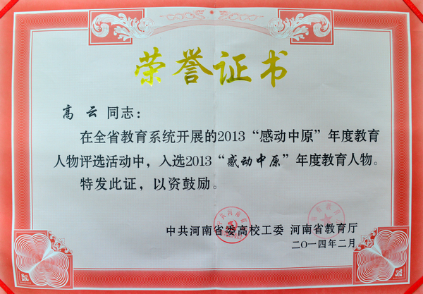 近日,从省教育厅获悉,我院常务副院长高云当选“2013感动中原”年度教育人物。这是全省民办高校获得此项殊荣的唯一代表,也是信阳地区获得此项荣誉的唯一代表。