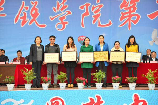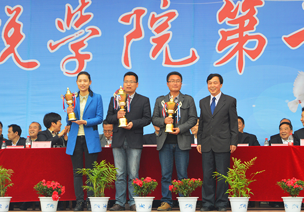 在喜庆的旋律中,院长施昌海为荣获团体总分前三名的单位颁奖;院党委书记张莉为荣获体育道德风尚奖、精神文明奖和优秀组织奖的单位颁奖;常务副院长高云为荣获啦啦操前三名的单位颁奖。 常务副院长高云致闭幕词。她首先代表学院向取得优异成绩运动员、教练员和各代表队致以热烈的祝贺,对为运动会顺利进行付出辛勤努力的裁判员和全体工作人员表示感谢!她指出,本次运动会从筹备到举办整个过程,组委会始终贯彻了“节俭、热烈、务实”的方针,遵循“增强体质、增进友谊、加强交流、促进发展”的原则,将运动会办得有声有色,无论是精彩的开幕式场面,还是各个比赛项目的激烈角逐,都充分展示了广大师生“奋勇争先、追求卓越”的拼搏精神,体现了我们的团队凝聚力和集体荣誉感。她强调,“团结铸就力量,奋斗创造佳绩”,号召我院全体师生以本届运动会为契机,继续加强学院体育和其它各项工作,贯彻实施“阳光体育”工程,积极开展丰富多彩的体育活动,用健康的体魄、乐观的态度和奋发向上的精神面对今后的工作、学习和生活。同时要继续保持和发扬“打出水平,赛出成绩”的高昂斗志,以满腔热情,投身到推动学院更快更好发展的进程中,用智慧和汗水,建设美好华锐!继续用健康的体魄、乐观的态度和奋发向上的精神面对今后的工作、学习和生活。