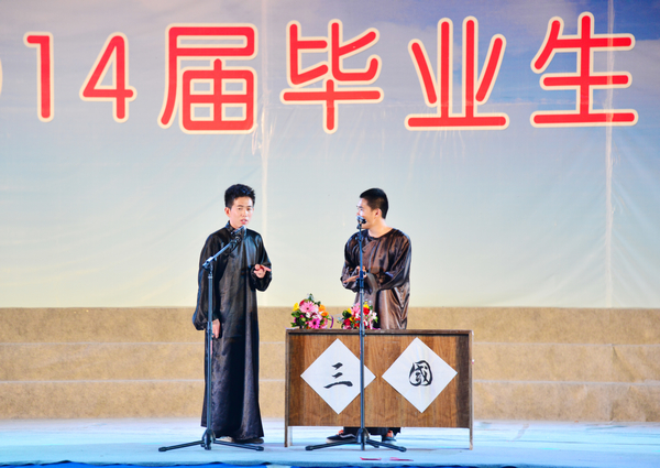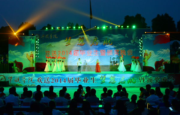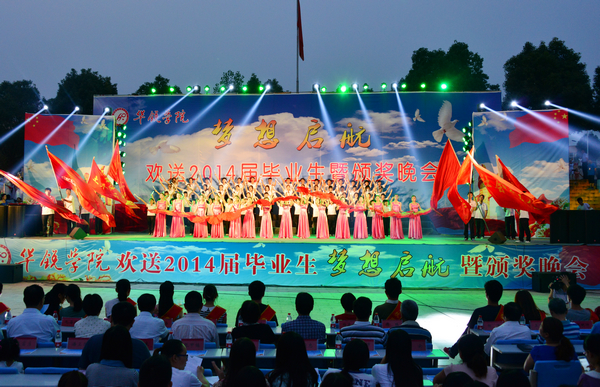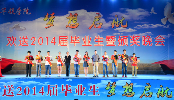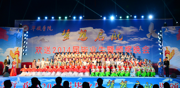 各系旗帜随着大合唱《光荣与梦想》的歌声飘扬,旗手们坚定的目光迎着梦想的方向,晚会大幕随即拉开。演出现场气氛热烈,一曲《信阳最美丽》表达了学子们对这片土地和华锐校园的热爱;当代歌舞剧《梦立方》展现了学子勇于追梦的群体姿态;一首《长大后我就成了你》唱出了学子们对老师的敬仰之情;舞蹈《毕业照》中每一个优美的动作虽然无言,却可以从中深刻的感受到毕业学子对母校的依依不舍之情;歌曲串烧《让我们荡起双桨》的旋律仿佛让全院师生回到了那时的青春年少,《那些花儿》让师生们铭记起时光的流转,送别的号角已吹响动人的《离歌》,勇敢的我们即便含泪也要向前《奔跑》,《相信自己》没有到不了的明天;歌曲《我要飞》节奏动感十足,歌唱者与学子互动对唱,引来阵阵欢呼;相声《一肚子三国》结合大四毕业生现状引出话题,诙谐幽默,引得全院师生笑声连连。 晚会期间,董事长高峰和各位院领导分别为“第六届青年教师教学技能竞赛”获奖教师、“第五届校园明星”、首届“寻找校园里的感动——我最喜爱的老师”获奖教师和“优秀组织单位”颁奖。 茶香化祝福,师恩记于心。《茶谢恩师》以明快的音律和曼妙的舞姿表达着莘莘学子对老师浓厚的情谊。晚会在艺术系师生的浓情演绎的大合唱《同一首歌》中落下帷幕。整场晚会艺术表演情真意切、声光绚烂、精彩纷呈。衷心祝愿2014届毕业生们前程似锦,也希望广大在校学子能够迈上学院转型发展的“快车道”,将自己尽早锻造成能够报效祖国、服务社会的应用型人才,与学院共同砥砺前行。