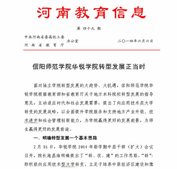 日前,河南省高校工委、河南省教育厅在其主办的《河南教育信息》和教育厅官方网站,以《信阳师范学院华锐学院转型发展正当时》为题刊发文章,宣传推广我院转型发展工作经验。
