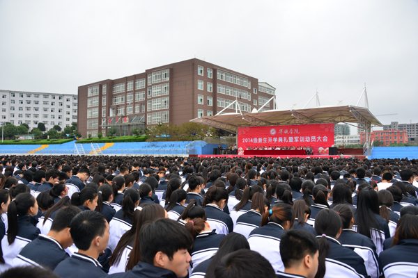 9月12日上午,学院2014级新生开学典礼暨军训动员大会在田径场举行。董事长高峰,院长施昌海,党委书记张莉,常务副院长高云,副院长王志华、毛海涛,各单位负责人、特聘教授及承训部队首长南立波出席大会。承训部队教官、各系行政秘书、学工秘书、新生辅导员和2014级新生参加了会议。大会由张莉主持。