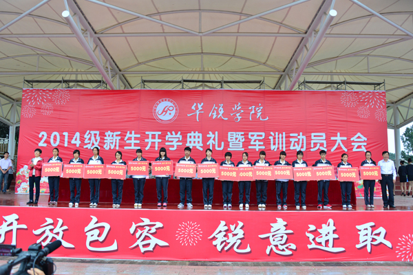 典礼在庄严的国歌声中拉开序幕。高云宣读了《关于表彰2014级优秀新生的决定》,学院利用“院长基金”对高考成绩高于上一批次录取控制线的优秀新生给予一等奖,奖金各10000元,对各系文理科高考成绩第一名优秀新生给予二等奖,奖金各5000元。高峰、施昌海、高云共同为获得优秀新生奖学金的社会科学系刘姗等22名新生颁奖。 施昌海发表了热情洋溢的讲话。他代表学院对新同学的到来表示祝贺和欢迎,向承担我院军训任务的71625部队官兵表示问候和感谢。他结合参加中青网“我为学校代言活动”的切身感受,简要回顾了近年来学院取得的办学成果,并向全体新生作出“只要你拥有美好梦想,学院就会为你给力,帮助你去实现”的庄严承诺,表达了“华锐学院将助力你实现美好梦想”的良好祝愿。 施昌海强调,大学时期是人生成长历程中最为宝贵和最为重要的阶段。金色的青春年华,丰满的健康体魄,活跃的思维细胞,都是同学们成长进步的资本和优势,希望大家能够珍视和发挥好,尽快适应新的学习生活,在华锐学院这片沃土上,放飞梦想、奋力成才。 在这令人激动的时刻,施昌海向同学们提出了三点希望和要求:第一,勤于学习。习总书记在今年五四期间向全国青少年提出“勤学、修德、明辨、笃实”的殷切希望中,首要的就是希望大家做到勤于学习。衷心希望同学们,虽历经十年寒窗之苦,却决不丝毫懈怠,能够在新的学习阶段和新的学习环境中,继续保持勤学之志,在勤学中进步、在勤学中成才,通过勤学实现自己和祖国的美好梦想。第二,善于思考。思考与学习相联,是学习的延续与深化。希望同学们在学习过程中要更加注重思考,把自己大脑的智力细胞有效地激活、调动起来,让它们积极参与学习过程,实现创造性地学习。第三,勇于实践。实践出真知。实践也是学习的一种方式,与学习书本和理论知识并行不悖、相辅相成。希望同学们能够在师长和学长们的指导和帮助下,在学院推进转型发展所创造的优越学习条件下,在勤学、善思的同时,做到勇为,大胆实践和创新;用勤于学习、善于思考、勇于实践的良好习惯与品格,把自己铸就成为党和人民满意、深受社会欢迎的栋梁之才。 施昌海希望同学们以崭新的精神风貌投入新的大学学习生活,从接受军事训练开始,认真做好大学时代的每一门功课,以无可争议的优异成绩,为实现自己的人生理想和中华民族伟大复兴的中国梦打好坚实基础,成为让学院感到骄傲和自豪的新一届优秀大学生。 南立波指出,军训是大学生活的前奏,不仅能增强体魄,提高国防意识,还有助于塑造坚忍不拔、迎难而上的坚强品格。希望同学们在服从命令中明白组织纪律,在“摸爬滚打”后学会艰苦奋斗,在相互协助时感受团结友谊,成为有理想、有道德、有文化、有纪律的高素质复合型人才。
