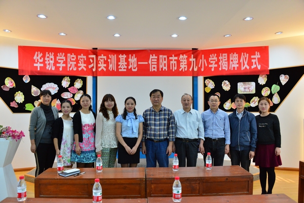 10月10日下午,华锐学院实习实训基地—信阳市第九小学揭牌仪式在九小会议室举行。第九小学校长周雁翎,副校长杨镝、齐荣、白兰,我院副院长毛海涛,外语系主任罗德喜,实践教学中心主任张忠锁,院长办公室副主任张富庄,九小有关负责同志以及外语系部分师生参加了揭牌仪式。