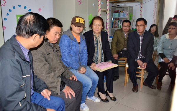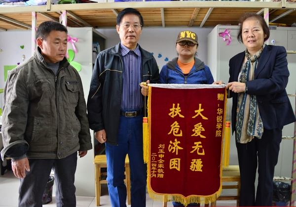 在听完社科系主任陈录生介绍老师和同学们为刘亚会捐款的情况后,刘亚会同学的父亲已是热泪盈眶、泣不成声,不断地说道:“谢谢老师和同学们的救命钱,谢谢……”转身,他从背包中拿出一面“大爱无疆 扶危济困”锦旗送给张书记,并激动地说“我代表全家,谢谢高董事长,谢谢学院的领导、老师和同学们……”并拱手弯腰向在场的领导、老师一再行礼表示感谢。