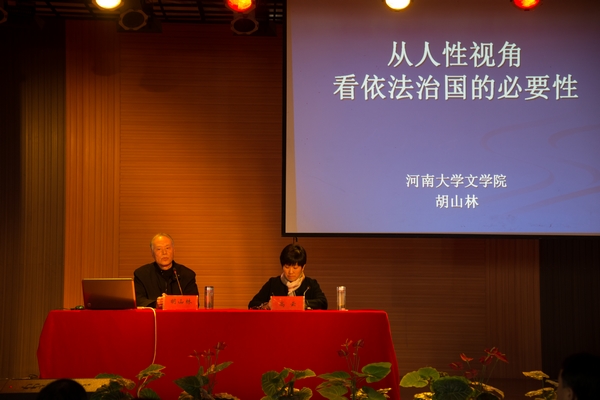 11月19日下午,河南大学文学院文艺学和艺术学硕士生导师胡山林教授,应邀在我院大学生活动中心为师生们作了题为“从人性视角看依法治国的必要性”的精彩讲座。院长施昌海,党委书记张莉,常务副院长高云,副院长王志华,各系各部门负责人、全院教职工及学生代表聆听了报告。报告会由高云主持。