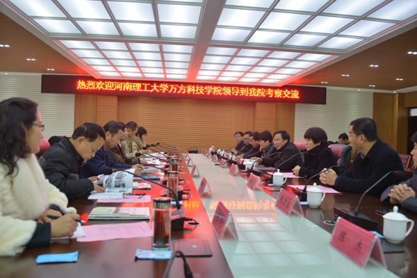 12月12日,河南理工大学万方科技学院院长王裕清,党委书记王建中带领教务处、学生处、团委和党政办公室等部门负责人来我院考察交流。我院院长施昌海、党委书记张莉、常务副院长高云、副院长毛海涛及相关职能部门负责人热情接待了来访客人。双方在行政楼208会议室进行了座谈交流。张莉主持了座谈会。