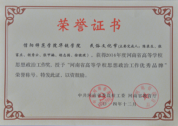 近日,从河南省教育厅获悉,我院上报的《学生党员、干部‘五个一’工程》和《民俗文化节》两个学生工作品牌被评为了2014年度“河南省高等学校思想政治工作优秀品牌”。
