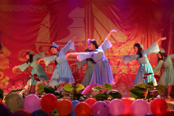 晚会在动感欢快的欧美爵士舞《Boom Boom Pow》中拉开帷幕,紧凑激昂的节拍瞬间吸引了观众们的注意力;带着淡淡温暖和忧伤的《平凡之路》、高亢嘹亮的《站在高岗上》、充满自由力量的《光辉岁月》、旋律轻松的《不潮不用花钱》、吉他伴唱《天使的翅膀》等风格迥异的歌曲演唱,让人听得如痴如醉;相声《好学生和坏学生》用诙谐的言语在逗人一笑的同时也引人深思;劲爆激情的街舞《咆哮》、婀娜多姿的民族舞《望月》与古典优雅的歌伴舞《美丽的神话》令人赏心悦目;小品《刺秦》、《一路平安》和舞蹈走秀《舞动青春》以诙谐幽默的语言,夸张搞笑的动作引爆全体师生的笑点,将晚会推向一个个高潮;现场观众互动不断,“微博墙”滚动的词条传送着师生们美好的祝福。