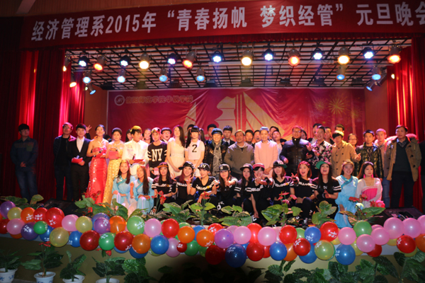 共度平安夜,齐享欢乐节。12月24日晚,经济管理系 “青春扬帆,梦织经管”2015年元旦晚会在大学生活动中心激情上演。院党委书记张莉教授、外语系主任罗德喜教授、社会科学系主任陈录生教授、经济管理系主任王金献教授、院办副主任张富庄、党办副主任张俊忠、学工部副部长张甲楠、团委副书记胡秀云、院办主任助理万建章等和经济管理系500余名师生观看了晚会。