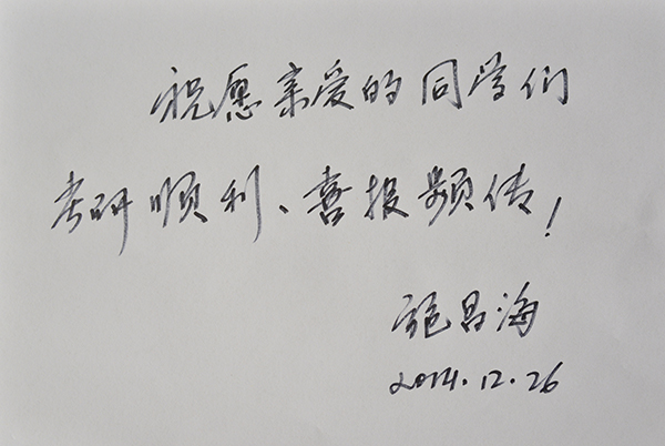 近期,在2015年硕士研究生考试即将举行之际,我院开展了“我为考研学子送祝福”活动,院领导和广大师生纷纷为考研学子写下温馨寄语,表达自己对考研学子最真挚的祝福,为他们在求学路上的追梦之旅加油助力。