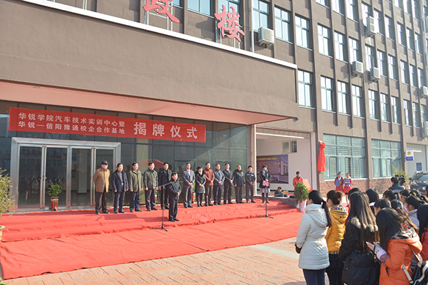 院长施昌海在仪式上发表了热情洋溢的致辞。他说,今天是华锐学院师生,特别是汽车服务工程师生的欢喜日子。大家高兴地迎来了信阳豫通汽车销售服务有限公司的董事长张先生和总经理李先生,及各位朋友来共同见证华锐学院汽车技术实训中心的挂牌仪式,并共同建立合作基地,拉开双方合作的序幕。