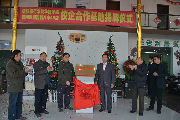 在上述活动开始前,毛海涛等应邀前往信阳豫通吉利汽车4S店,为我院设在信阳豫通汽车销售服务有限公司的实训基地揭牌。