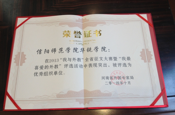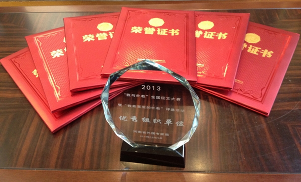 在全国及全省举办的外事方面竞赛活动中,我院取得了骄人成绩。2014年,在由国家外国专家局和《国际人才交流》杂志社组织筹办的“我与外教”全国征文及“我最喜爱的外教”评选大赛中,经过积极地宣传和组织,我院在激烈的竞争中取得了傲人的成绩。在全国赛场中,我院荣获最佳组织单位奖,外事办秘书芦金凤的征文《假如时光能够停止》荣获三等奖,多名师生获优秀奖。在全省赛场中,我院成为最大赢家,荣获最佳组织单位奖,外教Matt荣获“我最喜爱的外教”称号,多名师生荣获征文二等奖及优秀奖。
