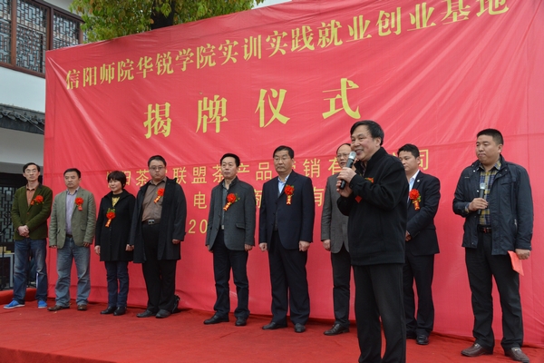4月19日上午,春雨绵绵润花开,我院与信阳淘大电子商务有限公司(淘大公司)、信阳茶客联盟茶产品营销有限公司(茶联公司)合作共建就业创业与实践教学基地揭牌仪式在淘大公司隆重举行。信阳市商务局副局长王中锋和市商务局、人事局等有关方面负责人何祖琴、张邦林、刘永尚,我院院长施昌海、副院长毛海涛,淘大公司董事长夏阳、总经理王磊,信阳仁和商贸公司总经理杨学强等出席揭牌仪式。我院有关部门负责人张忠锁、张富庄、陈杰、郭二军和招就部、数计系部分师生共同参加了本次活动。