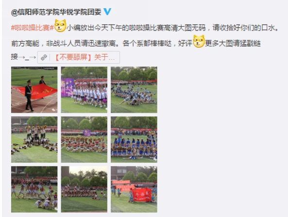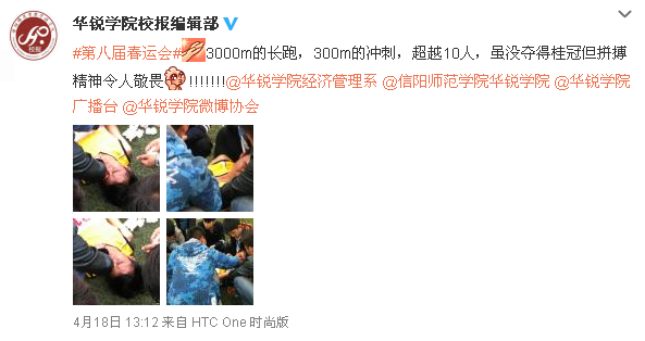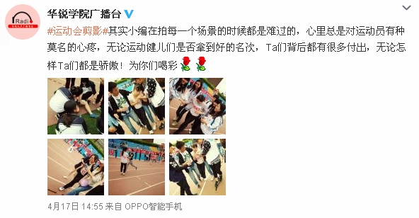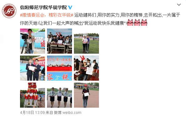 运动会期间,校园新媒体的师生通讯员们,深入田径赛场、检录处、成绩发布站和志愿者休息区等处,用手机和相机的镜头记录赛场上的精彩瞬间,用“接地气”的新媒体报道语气创作了大量动态消息,确保了赛事信息的精准、快速传递。如“华锐学院微博”“华锐学院团委微博”“华锐学院校报编辑部微博”“华锐学院校园广播电台微博”“华锐学院微博协会”及其微信平台等多个校园新媒体,对运动会进行了快节奏的实时报道,这些校园新媒体作为对校园网、校园广播等传统媒体的延伸,有效保障了师生们及时、准确、全面的掌握运动会赛况。