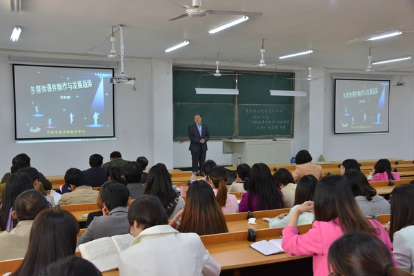 4月22日下午,实践教学中心主任张忠锁教授应邀在人文楼108教室作了题为《多媒体课件制作与发展趋势》的主题讲座。副院长毛海涛、教学部副部长于祥杰、教学部部长助理邓荣娟与各系(部)青年教师一起聆听了讲座。讲座由毛海涛主持。