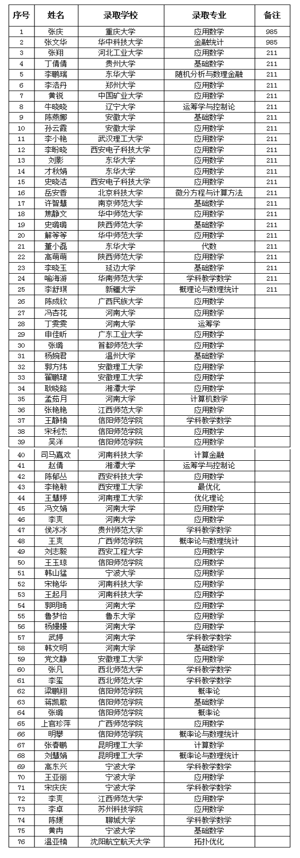 今年,在数学与计算机科学系251名应届毕业生中,76名同学考取硕士研究生,其中2名同学被985高校录取,23名同学被211高校录取,考研录取率达到30.28%……这一连串令人惊喜的数字是他们顽强拼搏,执着追梦的最好见证。