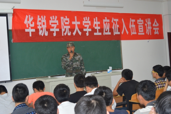 日前,我院应征入伍工作宣讲会在社科楼216教室举办。2015年信阳市征兵形象大使、我院社会科学系2009级校友李睿应邀作了宣讲报告。学生工作部、武装部、社会科学系有关教师与来自各系的200余名男生到现场聆听了报告。