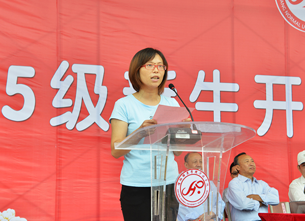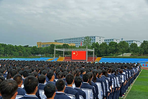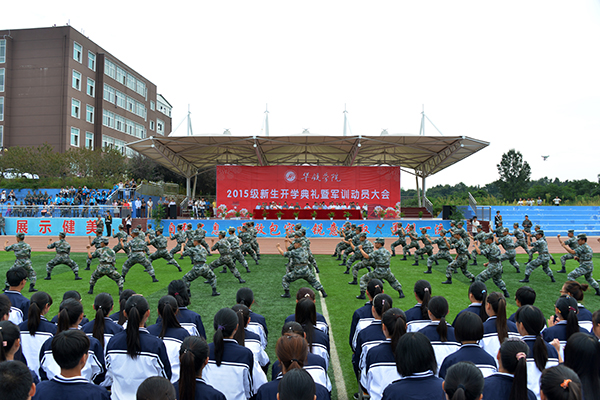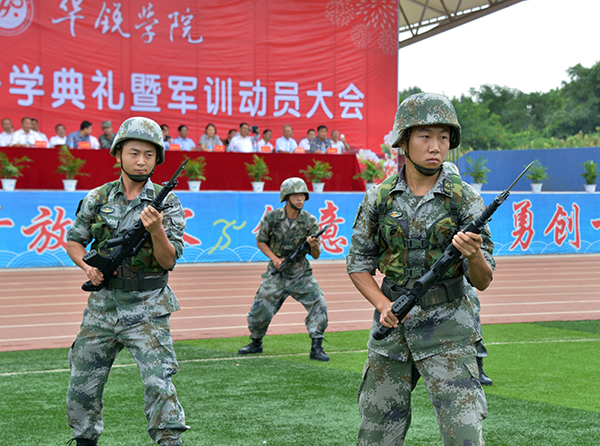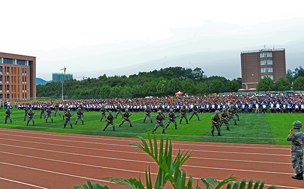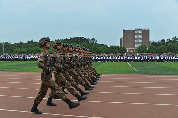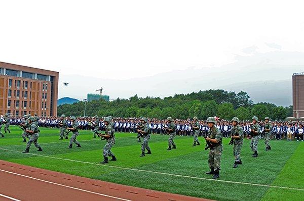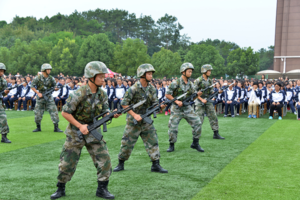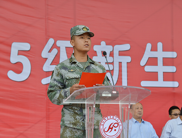 新生代表夏姗姗、老生代表陈帅先及教师代表王改霞先后进行了发言。随后,承训部队官兵进行了精彩的军体拳、刺杀操、侦察兵技能和阅兵分列式等军事科目表演。其中,有“铁军”美誉的该部“刘老庄英雄连队”10名刚参加过天安门9•3大阅兵的优秀战士,迈着整齐划一、铿锵有力的正步,米秒不差、精神抖擞地走过田径场,向师生们展示了当代人民子弟兵“有灵魂、有本事、有血性、有品德”的飒爽英姿,同时也向广大新同学诠释了“团结就是力量、个人进步在于集体”的人生真谛,强烈激发了师生们的爱国情怀。承训部队教官代表孙建利作了军训动员发言。