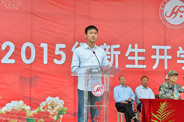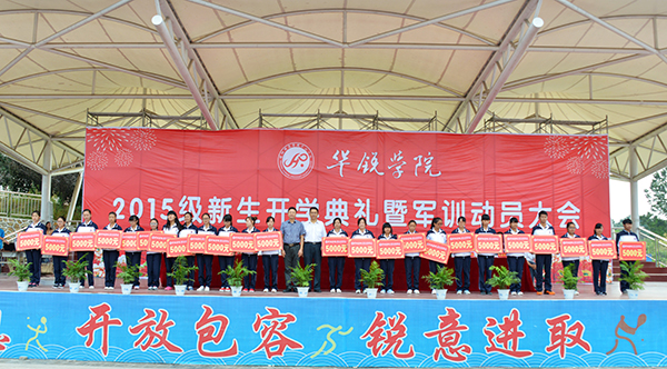典礼在庄严的升国旗、奏国歌仪式中拉开序幕。毛海涛宣读了《关于表彰2015级优秀新生的决定》,学院利用“院长基金”对高考成绩高于上一批次录取控制线的优秀新生给予一等奖,奖金各10000元;对文理科成绩达到452分以上的优秀新生给予二等奖,奖金各5000元;对综合分名列美术类和音乐类专业第一名的优秀新生给予二等奖,奖金各5000元。施昌海、傅洪涛、王志华分别为获得优秀新生奖学金的陈序等31名同学颁奖。