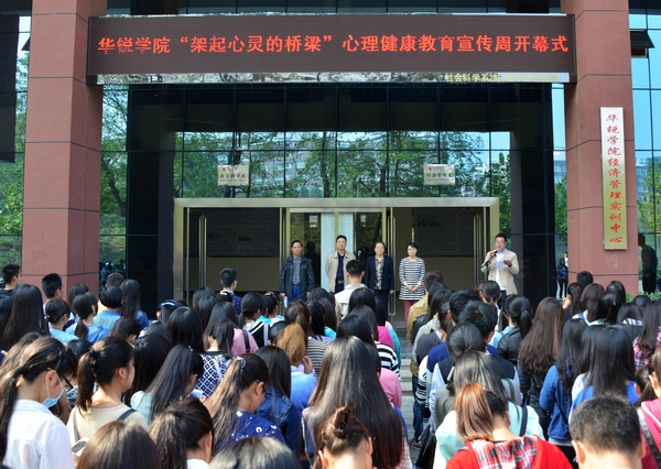 为认真贯彻落实上级精神,进一步开展好学院大学生心理健康教育工作,促进学生健康成长成才,10月20日上午,学院2015年度大学生心理健康教育宣传周活动在社科楼前隆重开幕。院党委书记张莉、副院长王志华出席开幕式。大学生心理健康辅导中心主任陈录生、副主任张甲楠,团委副书记胡秀云、各系学工秘书、辅导员、心理委员和500多名学生代表参加了本次活动。 开幕式由张甲楠主持。