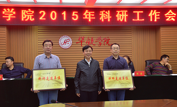 高云在会上宣读了学院《关于表彰奖励2014年度科研成果的决定》和《关于表彰2014—2015学年科研先进单位、科研标兵和科研先进工作者的决定》。决定授予外语系和理工系“科研先进单位”称号,授予沈守强、刘仁植“科研先进标兵”称号,授予李静、李晓娜、董玉静、周善春、王松、訾同超、张俊忠、张红梅、历宁宁、袁文霞、张玉兰、李海丽、芦金凤、张敬生、赵丹、刘磊、杨子泉、王俊、赵佳、贾彦茹“科研先进工作者”称号。与会领导为科研先进单位和先进个人颁奖并合影留念。