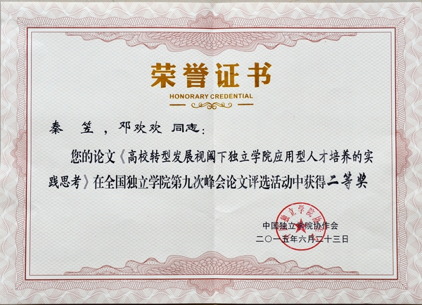 大会还表彰了会议优秀论文,其中,我院教师秦笠、邓欢欢的论文《高校转型发展视域下独立学院应用型人才培养的实践思考》获得第九次峰会论文二等奖。