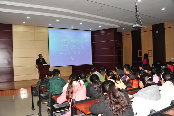 日前,信阳知名作家陈春仁作为我院中文系“南山讲坛”第五期特邀嘉宾,在图书馆102学术报告厅作了一场题为《我的文学江湖》的报告。中文系南山诗社全体成员及部分师生聆听了报告,信阳晚报、信阳周刊等媒体对此活动进行了关注报道。