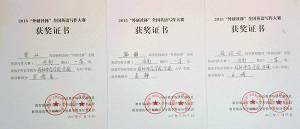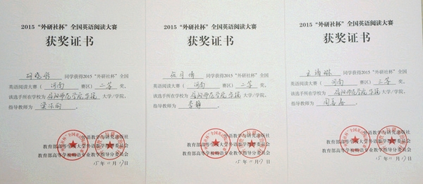 日前,2015“外研社杯”全国英语写作、阅读大赛河南赛区复赛在华北水利水电大学隆重举行。经过激烈角逐,我院外语系贾双、韩静、侯欢欢三位同学均获写作大赛一等奖,胡晓彤、张月倩两位同学获阅读大赛二等奖,王靖琳同学获阅读大赛三等奖。