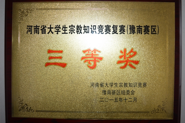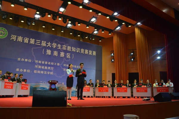 日前,由中共河南省委高校工委、河南省教育厅主办的河南省大学生宗教知识竞赛豫南片区复赛在信阳师范学院艺术楼音乐厅举行,包括我院在内的豫南片区9所高校代表队参加了本次比赛。由中文系2014级汉语言文学本科6班的杨雪莉、经济管理系2014级财务管理1班的张琳、外语系2015级英语师范5班的张静3名同学组成的我院代表队获得三等奖。