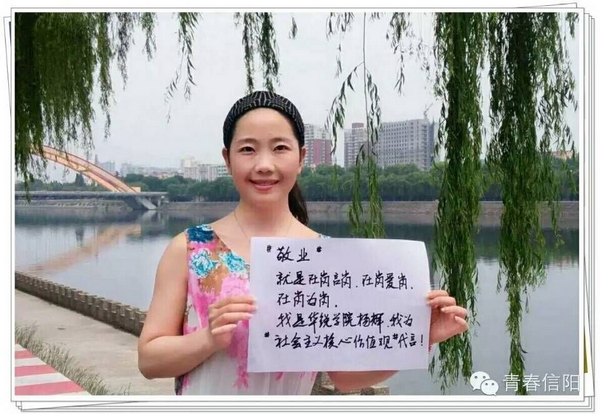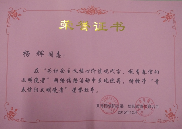 据悉,“为核心价值观代言 做青春信阳文明使者”网络传播活动自5月12日开展以来,共收到照片近万张,在“青春信阳”微信平台选取170张优秀照片分17组进行展播,杨辉老师在第四组中以小组第一名的成绩直接进入决赛,并被评为“青春信阳文明使者”。