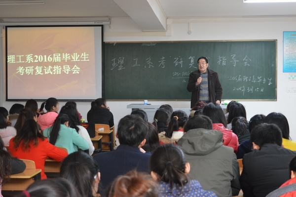 为加强分类指导,为有志于考研深造的同学提供咨询服务,3月15日中午,理工系在理工楼311教室召开了2016届毕业生考研复试指导会。系主任魏明坤、各位秘书、各专业骨干教师、毕业班辅导员以及全体2016届考研初试过线同学参加了会议。