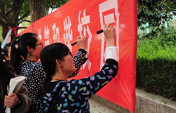本次签名活动由校卫队等学生组织发起,以“增强文明意识,共筑和谐校园"为主题,倡议广大师生自发签名,庄严承诺自觉为创建文明校园作出应有贡献。与此同时,校卫队还面向师生组织了相关问卷调查和宣传卡片发放等活动,提示广大师生时刻关注校园文明和自身安全,共建文明校园。签名活动结束后,王志华等还走进了学生二餐厅,实地查看了师生就餐、窗口经营、餐厅文明卫生秩序等情况,并与师生、餐厅工作人员、校卫队员、伙委会成员和志愿者等进行了亲切交流。