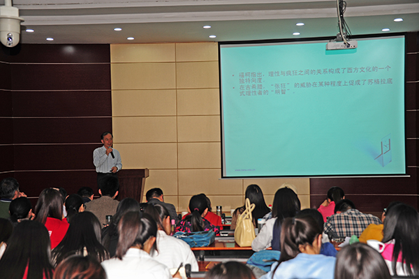 高教授运用生动的语言和典型事例,从写作动机与背景、著作的主要观点、德里达对福柯的批评及福柯对批评的回应等方面,向现场师生诠释了法国著名哲学家米歇尔•福柯的重要代表作《古典时代疯狂史》所表达的哲学思想。他引用学界对福柯研究的主流观点指出,与其说《古典时代疯狂史》是史学,不如说是诗学,是福柯认识和拯救自己的著作,通过研究中世纪以来的“疯狂”,这一人类“不正常”的现象和这一类“不正常的人”,福柯质疑了人们传统观念中的理性和智慧,在福柯看来,一部疯狂的历史,其实就是理性和智慧压制放逐人类“疯狂”这一本性的历史。