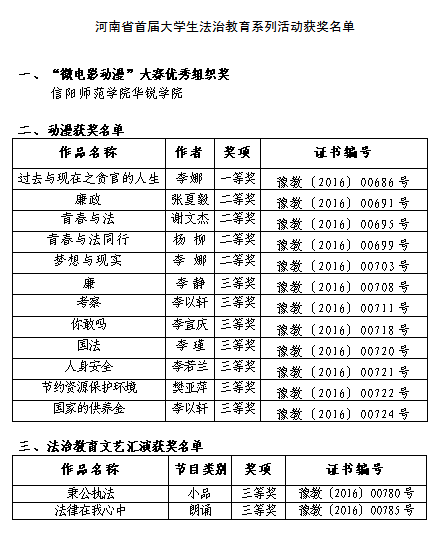 日前,河南省教育厅、河南省司法厅、河南省普法教育工作领导小组办公室联合印发《关于公布全省高校大学生法治宣传教育系列活动获奖名单的通知》(教社2016[175]号),对全省高校大学生法治宣传教育系列活动进行总结表彰。其中,我院荣获优秀组织奖;我院学子参赛作品取得优异成绩,在“微电影动漫”大赛中,获一等奖1项、二等奖4项、三等奖7项;在法治教育文艺汇演中,获三等奖2项。
