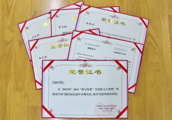 在此次大赛活动中,我校继去年获奖后,再次获得“优秀组织单位”荣誉;我校教师踊跃参与,取得了优异成绩,多人次获奖。外国语学院杨淑芳老师荣获征文类二等奖,陈俊明老师荣获征文类三等奖,董文静老师和马大乔同学荣获征文类优秀奖;美籍外教Matthew Monte Ensweiler 荣获摄影展评活动优秀奖。