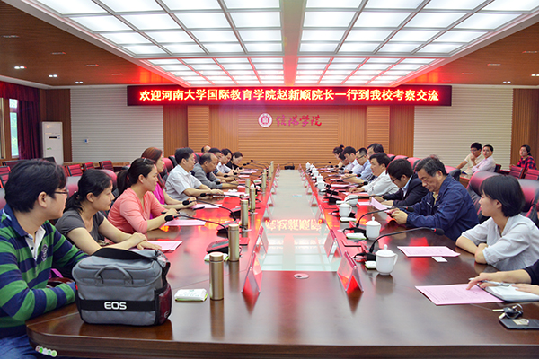 施昌海致欢迎辞。他对赵新顺一行到我校考察交流表示欢迎,并向客人们简要介绍了我校发展情况。他说,学校更名信阳学院后,拥有更好的发展条件和更大的发展空间,理事会领导非常重视推动学院向国际化办学方向发展。河南大学国际教育学院长期从事国际教育,具有先进的国际合作办学理念和经验,是我省开展国际教育的一面旗帜。赵院长是知名的国际合作办学专家,此次率队来访,为信阳学院发展国际教育提供了很好的学习机会。希望赵院长等不吝赐教、传经送宝,使信阳学院在国际合作办学方面少走弯路、加快步伐。