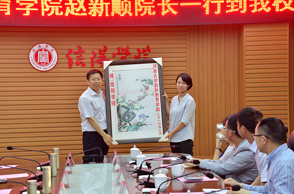 赵新顺对我校领导的热情接待表示感谢,对我校的办学理念和办学成就,尤其是我校的优美校园、浓厚学风和考研成绩表示赞赏。他简要介绍了河南大学国际教育学院发展情况。他指出,河南大学国际教育学院自2002 年成立以来,不断探索总结国际教育经验,扩大合作办学领域,创新合作办学模式,取得了显著成效。目前,已与澳大利亚、美国、俄罗斯等国多所高校建立了紧密合作关系,有些基本做法可供信阳学院借鉴和参考。