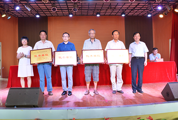 在欢快的音乐声中,大会举行了隆重的颁奖仪式。高云、施昌海为获得2015—2016学年目标管理考核优秀单位的负责人陈录生、罗德喜、傅瑛、魏明坤等颁发了奖牌;校领导向获得2016年生源优势专业所在单位负责人傅瑛、罗德喜、陈录生、王金献、郝涌等颁发了奖牌。