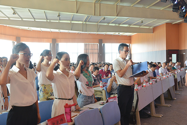 随后,人事处负责人李赟带领全体新教师面向国旗,进行了庄严的入职宣誓仪式。