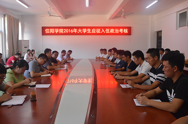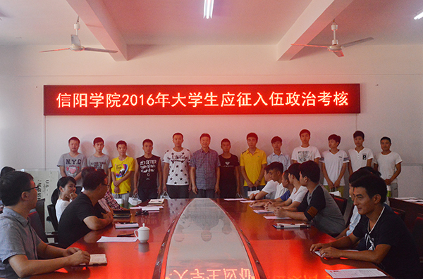 8月29日上午,学校2016年大学生应征入伍政治考核工作在行政楼206会议室进行。副校长王志华出席会议,武装部、党办、保卫处有关负责人,部分学院党总支副书记及辅导员组成考核小组,对应征入伍的24名同学进行了政治考核。
