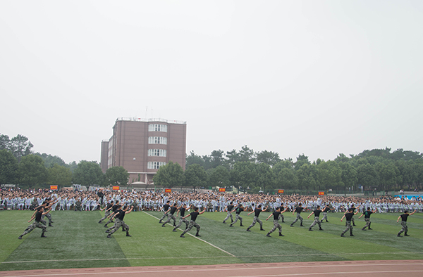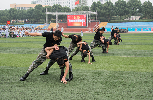随后,承训部队官兵进行了队列示范、军体拳和刺杀操等精彩的军事科目表演。新生代表孙苗苗、老生代表甄倩文、教师代表黄亚妮、承训部队教官代表井二威等先后进行了大会发言。