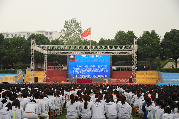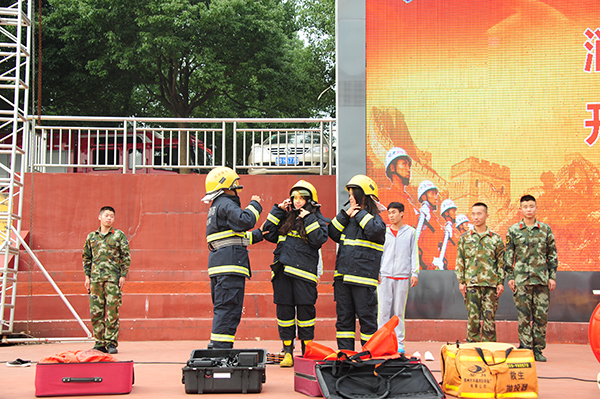 国防报告会结束后,学校举行了“消防进军训,开学第一课”消防安全讲座及消防器材展示、消防逃生演练活动。信阳市消防协会有关负责人陈波进行了消防知识宣讲,信阳市高新区消防大队的消防员们在现场展示了生命探测仪、防化服、液压钳等消防器材,演示了消防服穿戴、家用液化气罐着火的紧急处置、灭火器使用方法和低姿逃生等,生动的教学演示和互动,普及了消防安全知识,取得了良好的宣讲效果,受到了师生们的普遍欢迎。