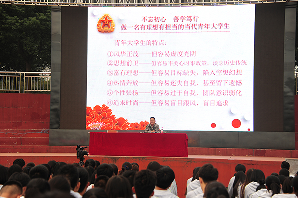 弘扬长征精神,维护国家安全。10月18日下午,学校2016级新生国防教育报告会及消防知识宣传活动在体育场举行,承训部队首长闫伟应邀作了题为《不忘初心,善学笃行》的国防教育辅导报告。学生工作处、各学院有关教师和2016级全体同学现场聆听了报告。报告会由学生工作处负责人张甲楠主持。
