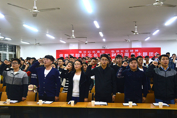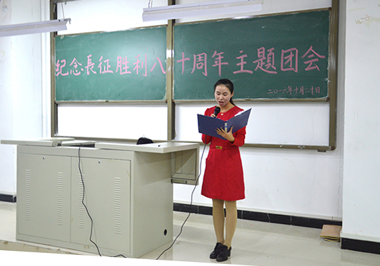 召开主题团会,宣讲“长征精神”。10月20日,团委、学生会召开纪念长征胜利80周年主题团会,通过组织学生骨干观看长征纪录片,朗诵和联唱经典红歌,现场研讨、宣讲长征精神,引导青年学生激活红色基因,传承和弘扬长征精神,自觉践行社会主义核心价值观,为学校更好更快发展汇聚正能量。
