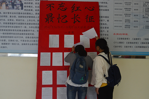 举办特色活动,坚定理想信念。10月21日,团委在图书馆广场前举行了传承和弘扬长征精神手绘展板比赛。各学院同学积极参与,通过手绘的形式纪念长征,学习和传承长征精神,缅怀先烈。10月21日至25日,各学院利用新媒体等网络平台,引导广大师生收看、回顾纪念红军长征胜利80周年大会实况,学习习总书记重要讲话精神。同时,通过组织学生观看长征主题教育影片并展开观影讨论,举行纪念长征胜利演讲比赛,举办“不忘红心,最忆长征”主题征文活动等特色活动,引导同学们传承长征精神,坚定理想信念。