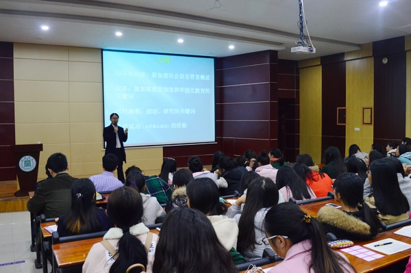 日前,应文学院邀请,新加坡南洋理工大学博士生导师陈志锐教授在图书馆102学术报告厅作了题为 《双语环境下的新加坡华语文教育》的学术报告。文学院200余位师生聆听了报告。