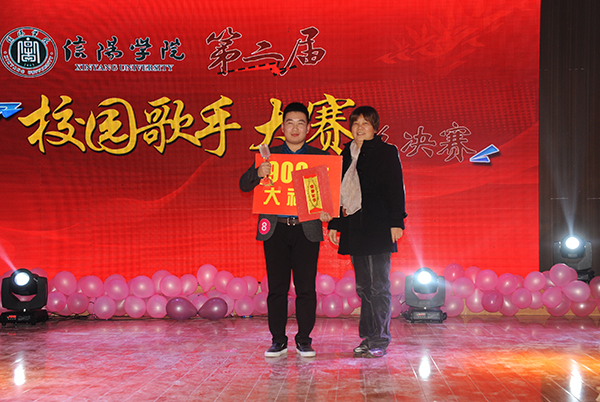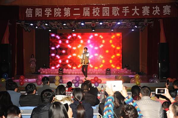 歌声乐动人生,梦想绽放校园。日前,由校团委主办、大学生艺术团承办的第二届校园歌手大赛决赛在大学生活动中心举行。党委书记张莉,副校长王志华,有关部门负责人胡秀云、叶十朋等和800余名师生共同观看了比赛。河南省音乐家协会会员、信阳市文广新局有关方面负责人朱奇禹,信阳市广播电视台主持人、我校优秀校友张舒,我校学生工作处负责人、信阳市流行音乐协会常务副会长张甲楠应邀担任大赛评委。