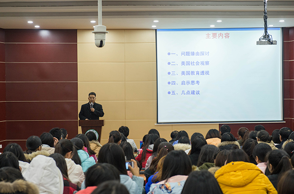 11月29日,河南大学发展规划处副处长王振存博士应邀在图书馆102学术报告厅作了题为《美国教育带给我们的启示与思考》的学术报告。校长施昌海、校长助理杨高伟、校长办公室副主任张富庄、信阳农林学院外国语学院副院长黄丽与我校外国语学院200余名师生聆听了报告。报告会由我校外国语学院院长罗德喜主持。