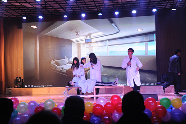 动感炫酷的爵士舞《Hot Pink》为晚会拉开了帷幕。整场晚会流行古典兼收、温情与火热并举,形式多样、精彩纷呈。歌曲串烧《牧羊曲》、《海阔天空》、《黄梅戏》等轮番登场。或温馨动人,或轻快悠扬,风格各异,美轮美奂的背景图也让人心生陶醉。同学们自编自导的《上海新滩》、《大城小事》、《感恩》等小品,语言风格独特,感情饱满,让观众捧腹大笑却又感动至深,将晚会推向了高潮。接下来的舞蹈串烧更是让人爆笑连连,奇异的服装,滑稽的舞步,魔性的反串给本次晚会增添了不少亮色。